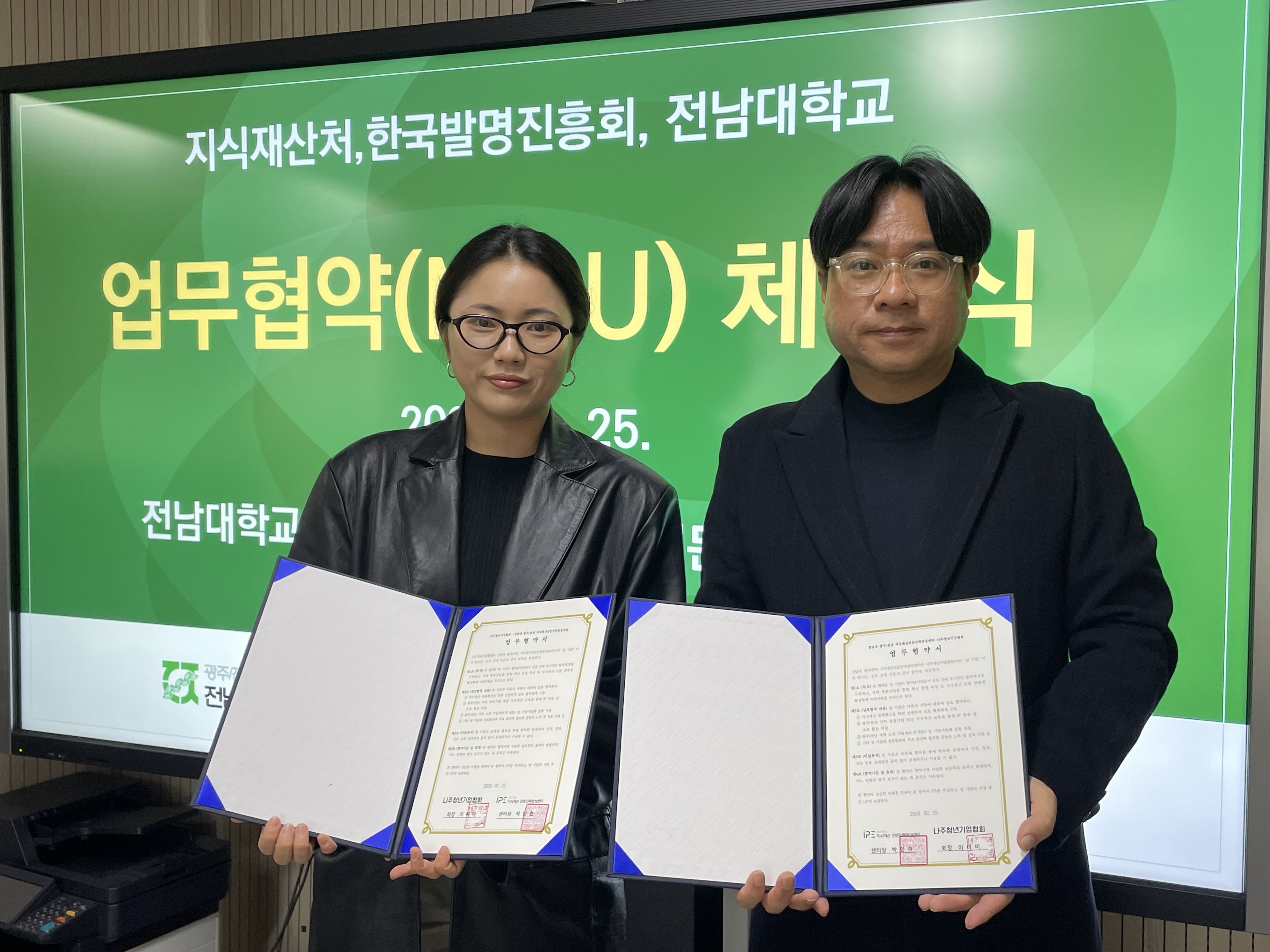 * 일정 : 2026년 2월 25일(수)* 장소 : 전남대학교 IP센터 회의실* 협약내용 : 광주/전남 지역 창업기업 대상 지식재산 교육을 통한 IP 창출 및 보호 활동 지원 등* 참석자 : 전남대학교 광주/전남 지식재산전문인력양성센터 김지웅 교수, 나주청년기업협회 이미미 회장