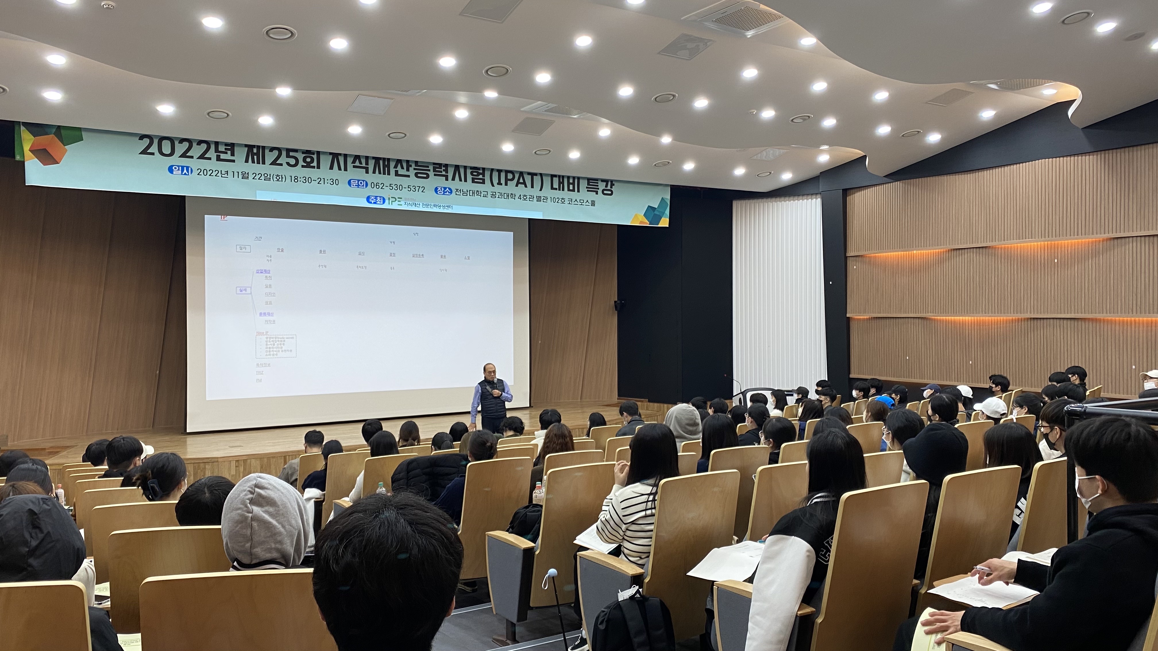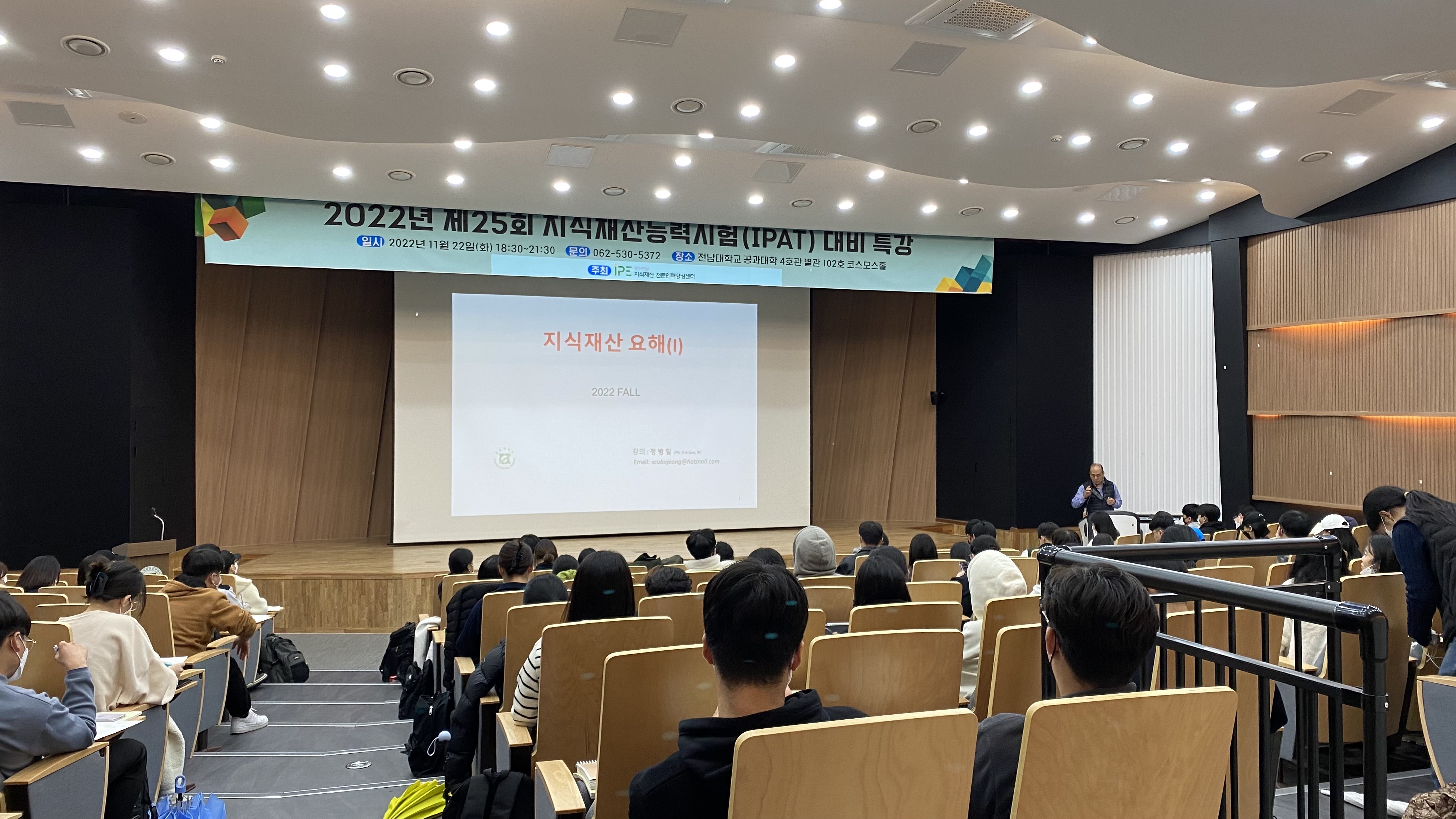* 일시 : 2022년 11월 22일(화) * 장소 : 전남대학교 공과대학 4호관 별관 102호 코스모스홀 * 주제 : 제25회 지식재산능력시험 대비 특강 * 주최 : 광주/전남 지식재산전문인력양성센터